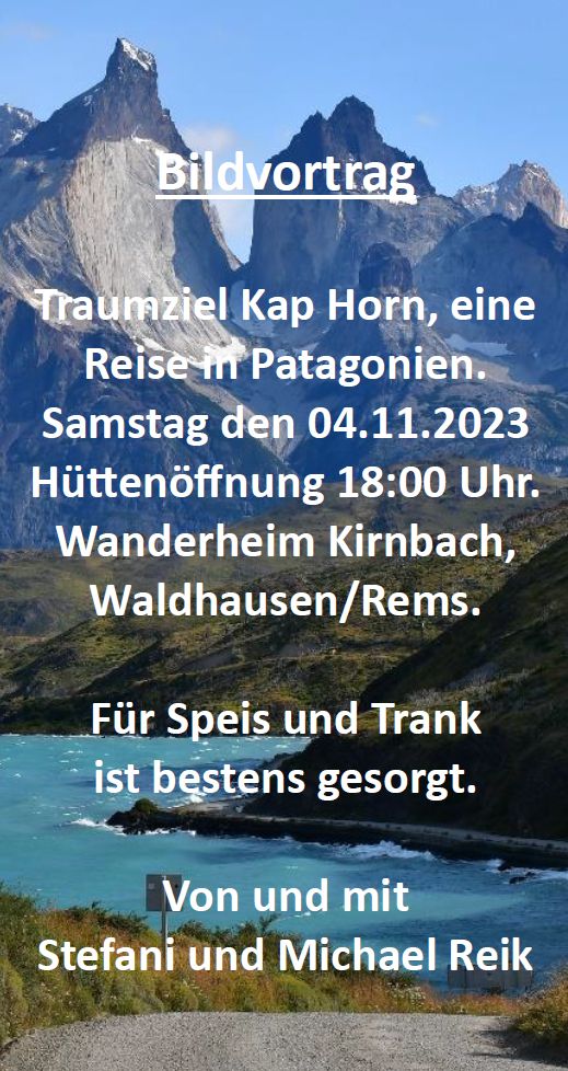 Bildervortrag „Patagonien“ Sa., 04.11.2023, Bildervortrag von und mit Stefani + Michael Reik Uhrzeit: 00:00 iCalendar Mit dem Laden der Karte akzeptieren Sie die Datenschutzerklärung von Google.Mehr erfahren Karte laden Google Maps immer entsperren zur Übersicht