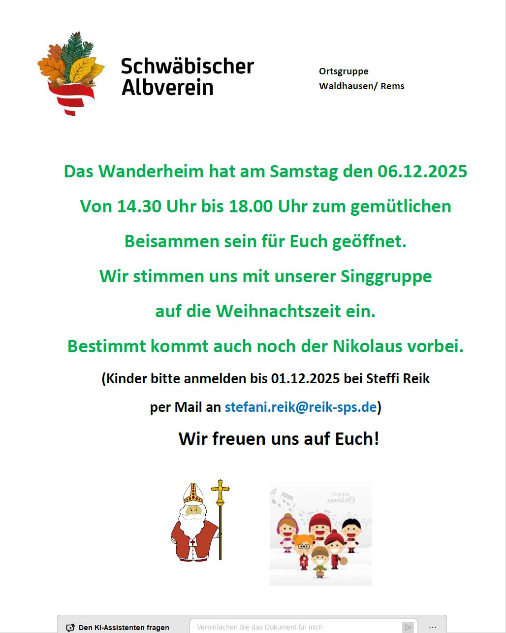 Gemütliches Beisammensein im Wanderheim Sa., 06.12.2025, Bild anklicken Uhrzeit: 14:30 - 18:00 iCalendar Mit dem Laden der Karte akzeptieren Sie die Datenschutzerklärung von Google.Mehr erfahren Karte laden Google Maps immer entsperren zur Übersicht